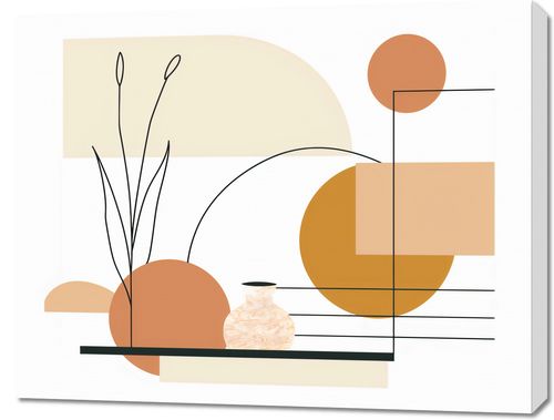 Obraz z serii boho zatytułowany Terrakotowy Krzyk.Obraz przedstawia misternie ułożoną kompozycję z geometrycznymi i organicznymi kształtami. Ujęte w stonowanej palecie barw terrakoty, beżu i czerni, delikatne linie roślin wynurzają się z minimalistycznego wazonu, a tło składa się z różnych form i kształtów, które tworzą poczucie głębi i równowagi.Ta grafika doskonale wpasuje się w nowoczesne, minimalistyczne wnętrza, które cenią sobie prostotę oraz wyrafinowanie. Może zdobić ściany w strefach wypoczynkowych, eleganckich salonach, a także stanowić punkt centralny w przestrzeniach takich jak jadalnie czy hol. Wyważony charakter plakatu sprzyja koncentracji i medytacji, co czyni go idealnym do pomieszczeń przeznaczonych do pracy kreatywnej lub odprężenia.