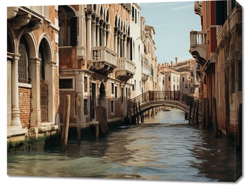 Obraz z serii pejzaże zatytułowany Wenecjańska Uroda, obraz ukazuje spokojny kanał w Wenecji, gdzie woda płynie leniwie, odzwierciedlając zabytkowe fasady wąskich domów. Delikatne światło rozlewa się po kanałach, a mały, kamienny most łączy ze sobą dwie tajemnicze ulice, dodając scenie romantycznego uroku. Ta idylliczna sceneria przenosi widza do serca włoskiej elegancji, pełnej historii i spokoju. Idealny do zawieszenia w przestrzeniach, które cenią klasykę i subtelne piękno, takich jak eleganckie salony, tradycyjne restauracje czy hotelowe lobby.