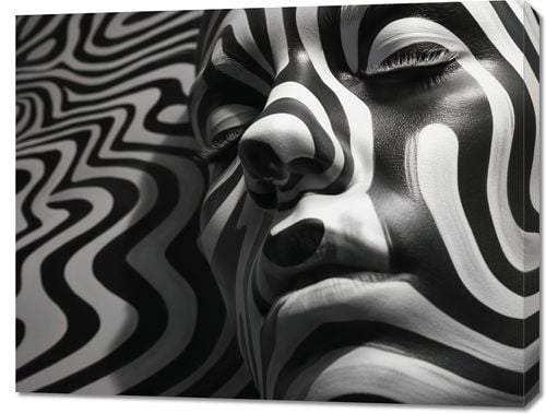 Obraz z serii abstrakcja zatytułowany Wtop Się We Mnie. Ten monochromatyczny obraz przedstawia zbliżenie na twarz kobiety, której skórę zdobią hipnotyzujące, czarno-białe wzory przypominające zebry. Skontrastowane linie zygzakowato przecinają płaszczyznę obrazu, tworząc złudzenie ruchu i głębi. Obraz jest przykładem wyrafinowanego połączenia sztuki portretowej z abstrakcyjnym designem, idealny do pomieszczeń o minimalistycznym lub nowoczesnym wnętrzu, takich jak galerie sztuki, nowoczesne biura, a także jako oryginalny akcent w domowym salonie. Jego unikalny styl przyciąga wzrok i zmusza do refleksji, stanowiąc idealny temat do rozmów w przestrzeniach społecznych.