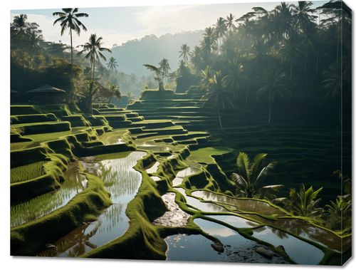 Obraz z serii pejzaże zatytułowany Zielone Sanktuarium. Sceneria prezentuje idylliczne tarasy ryżowe otoczone przez soczyste zieleń drzew palmowych i subtelną mgłę poranną. Delikatne światło słońca przebija się przez listowie, rzucając tajemnicze cienie i podkreślając wielowymiarowość krajobrazu. Harmonia kolorów i światła zachęca do refleksji i wyciszenia. Idealnie uzupełni przestrzeń domową, stając się oazą spokoju, jak również znajdzie swoje miejsce w przestrzeniach biznesowych, takich jak spa czy gabinety relaksacyjne, gdzie natura jest częścią terapii.