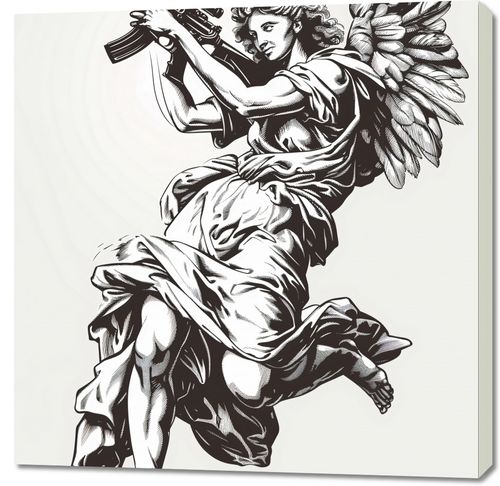 Obraz z serii pop art zatytułowany Anioł Wojny. Przedstawia on postać anioła w klasycznym stylu, jednak z nieoczekiwanym elementem współczesnym – trzyma on broń, co jest zaskakującym połączeniem tradycyjnej symboliki z nowoczesnymi motywami. Ta silna wizualna metafora może prowokować do refleksji na temat konfliktów, pokoju i dwoistości natury ludzkiej. Zastosowanie monochromatycznej kolorystyki wzmacnia dramatyzm kompozycji, a sama praca może stanowić wyrazisty akcent w nowoczesnych przestrzeniach, które cenią sobie głęboką symbolikę i odważne wyraz artystyczny.