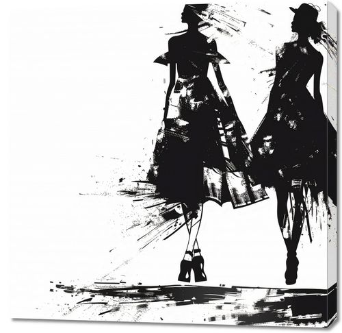 Obraz z serii wnętrza zatytułowany Atramentowy Przerys. Plakat ukazuje dwie stylizowane postacie kobiet w dynamicznej pozie, co nadaje wrażenie ruchu i elegancji. Obraz jest utrzymany w monochromatycznej palety kolorystycznej, gdzie silne kontrasty czerni i bieli tworzą dramatyczny efekt. Postaci są zredukowane do esencjonalnych form i plam atramentu, co przypomina szkice mody z charakterystycznym dla tego gatunku użyciem cienia i światła do zarysowania konturów odzieży i ciała. Energetyczne smugi i plamy atramentu sprawiają, że suknie wydają się falować i poruszać, a zarysowane w sposób abstrakcyjny obcasy dodają całej kompozycji współczesnego wyrazu. Ten obraz mógłby być wspaniałym dodatkiem do przestrzeni o nowoczesnym, artystycznym charakterze, takich jak atelier, modowe salony czy współczesne galerie.