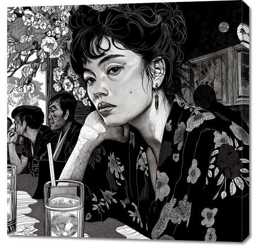 Obraz z serii motywy wschodnie zatytułowany Czarne Kimono. Przedstawia on czarno-białą scenę w restauracji, w której centralną postacią jest młoda kobieta o intensywnym spojrzeniu, ubrana w tradycyjny, kwiecisty kimono. Jej postać wyróżnia się na tle pozostałych gości, a szczegółowa grafika podkreśla wyraźne detale jej stroju i delikatnych rysów twarzy. Tło, zdobione motywem kwiatowym, nadaje głębi i kontekstu kulturowego, a całość kompozycji wywołuje atmosferę introspekcji i spokoju. Ten obraz idealnie nadaje się do wnętrz, które chcą oddać hołd klasycznej estetyce Dalekiego Wschodu lub po prostu wprowadzić element zastanowienia i piękna. Doskonale wpasuje się w przestrzenie takie jak salon, gabinet, a nawet miejsca publiczne, które pragną zapewnić swoim gościom wizualny odpoczynek i chwilę zadumy.