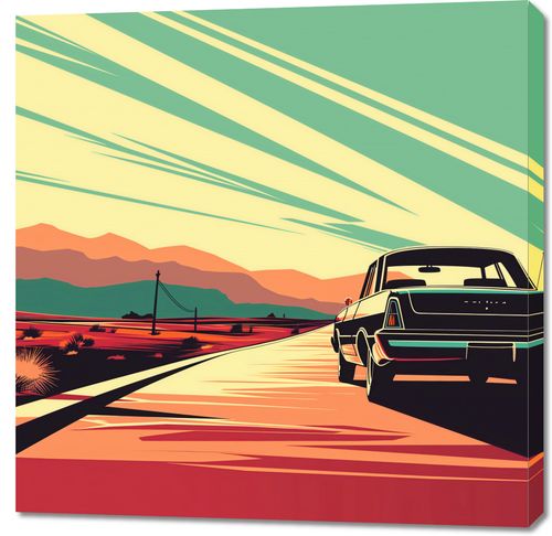 Obraz z serii pop art zatytułowany Droga przez Pustynię. Obraz przedstawia vintage samochód, prawdopodobnie model z lat 60., zaparkowany na pustynnej drodze z widokiem na zachód słońca. Złote i ciepłe odcienie nieba kontrastują z głębokimi cieniami pustyni, dodając głębi i dramatyzmu kompozycji. Design nawiązuje do złotej ery amerykańskich podróży samochodowych, przypominając o wolności i odkrywaniu nieznanych zakątków kraju. Idealnie sprawdzi się jako dekoracja w przestrzeniach inspirowanych vintage, takich jak retro kawiarnie, salony gier, domowe biblioteki, a także jako centralny punkt w salonie dla miłośników stylu mid-century modern.