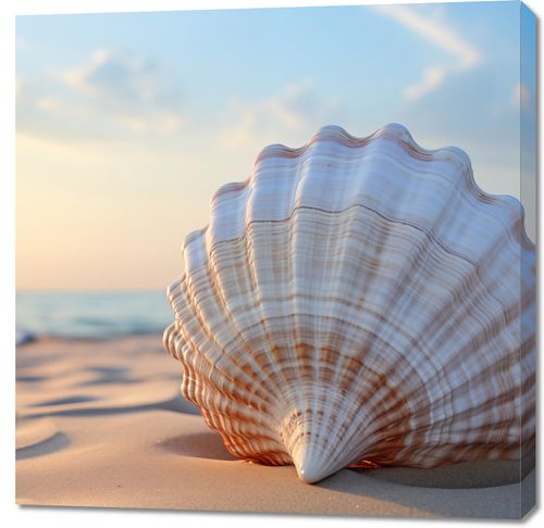 Obraz z serii natura zatytułowany Echo Morza. Delikatne, pastelowe barwy muszli występujące na pierwszym planie, z jej wyraźnymi liniami i subtelnym przejściem kolorów od kremowego do różowego, kontrastują z dynamicznym tłem zachodzącego słońca nad morzem. Złote refleksy światła na wodzie i miękki, piaskowy pierwszy plan tworzą poczucie głębi i spokoju. Idealny do wnętrz o tematyce morskiej, relaksacyjnych spa oraz jako element dekoracyjny w pokojach hotelowych z widokiem na morze.