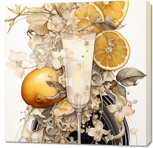 Obraz z serii wnętrza zatytułowany Esencja Cytrusów. Zmysłowy pejzaż ukazuje krystaliczną szampanową kieliszek otoczony bujnym kwiatem i soczystymi plasterkami cytryny. Delikatne białe kwiaty i misternie rysowane detale dodają kompozycji głębi i subtelności, podczas gdy wyraziste żółte akcenty cytryny dodają energii i świeżości. Całość wprowadza w stan relaksu i orzeźwienia, przypominając o chwilach spędzonych na letnich tarasach. Idealnie wpasuje się w eleganckie restauracje, bary koktajlowe lub nowoczesne kawiarnie z akcentami śródziemnomorskimi.