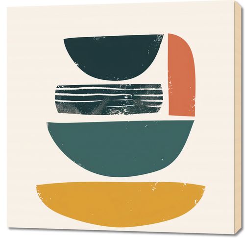 Obraz z serii boho zatytułowany Fale Wodne.Obraz prezentuje minimalistyczne podejście do natury za pomocą abstrakcyjnych, geometrycznych form. Półkoliste i prostokątne kształty w ziemistych tonacjach zieleni, niebieskiego i musztardowego żółcia układają się w spójną kompozycję. Tekstura przypominająca drewno lub fale wodne dodaje głębi centralnie umieszczonemu elementowi, stanowiąc serce i ognisko obrazu. Dzieło to idealnie pasuje do wnętrz, które cenią sobie spokój, równowagę i naturalne motywy, oferując jednocześnie nowoczesny wygląd. Będzie wyjątkowym akcentem w salonach, przestrzeniach biurowych, a nawet jako element uzupełniający w minimalistycznych sypialniach. Obraz może służyć jako wizualny element łączący różne części dekoracji wnętrza.
