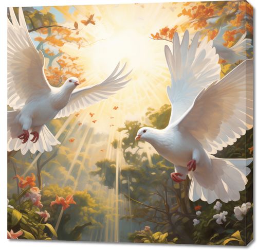 Obraz z serii natura zatytułowany Gołębie o Poranku. Ten pełen światła obraz przedstawia dwa białe gołębie w locie, majestatycznie rozpostartymi skrzydłami, na tle oświetlonego promieniami słońca ogrodu. Złote światło przesącza się przez liście, tworząc ciepłą i eteryczną atmosferę. Otaczające ptaki kwiaty w odcieniach pomarańczu i białego dodają życia i koloru do sceny, sugerując początek nowego, nadziei pełnego dnia. Ten obraz jest odzwierciedleniem spokoju, piękna i optymizmu, który natura może przynieść, idealny dla każdego wnętrza potrzebującego dotyku spokoju i inspiracji.