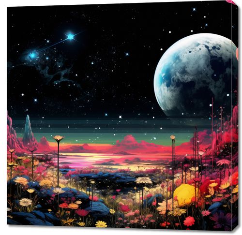 Obraz z serii pejzaże zatytułowany Inny Świat. Obraz ukazuje przepiękny, fantastyczny krajobraz, który łączy elementy kosmiczne z bujną, ziemską florą. Na pierwszym planie widzimy różnorodne, kolorowe kwiaty, które tworzą żywą, wręcz surrealną tapiserię natury. Za tym kwiatowym morzem rozciąga się widok na spokojne jezioro i majestatyczne, czerwone formacje skalne, które przywodzą na myśl marsjański krajobraz. W tle góruje olbrzymi księżyc, który dominuje na nocnym niebie pełnym gwiazd, a obok niego widnieje zarys konstelacji, dodając głębi i tajemniczości całej scenie. Obraz ten jest zaproszeniem do świata wyobraźni, gdzie natura i kosmos spotykają się w harmonii. Idealnie nadawałby się jako dekoracja do nowoczesnych przestrzeni mieszkalnych lub miejsc publicznych, które pragną wzbogacić swoje otoczenie o elementy fantastyczne i inspirujące do snucia marzeń.
