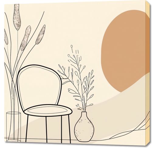 Obraz z serii boho zatytułowany Kącik Spokoju. Obraz prezentuje delikatny, linearny rysunek wnętrza, gdzie w centrum znajduje się eleganckie krzesło umieszczone obok stolika z wazonem i wysokimi, smukłymi roślinami. W tle, duża, okrągła forma w ciepłym, terra-cotta kolorze nadaje całości miękkiego, przytulnego charakteru. Linearna, subtelna paleta barw oraz gra cieni i światła tworzy atmosferę relaksu i wyciszenia. Ten obraz będzie doskonałym wyborem do dekoracji wnętrza, które ma być przestrzenią do odpoczynku i regeneracji. Jego prostota i elegancja sprawią, że doskonale odnajdzie się w salonach, pokojach do czytania, gabinetach czy medytacyjnych kącikach, wprowadzając spokojny i zbalansowany nastrój.