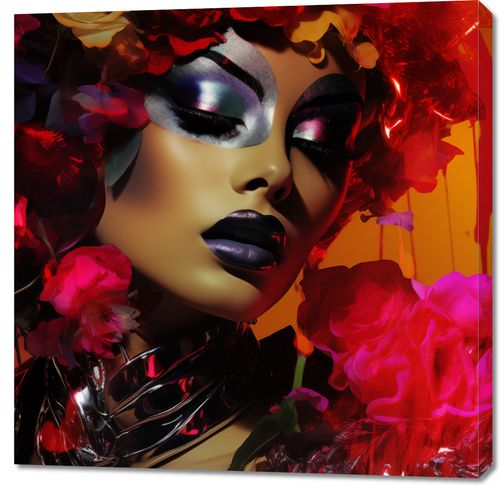 Obraz z serii abstrakcja zatytułowany Kwiecista Diva. Ta barwna kompozycja portretuje twarz zmysłowo zamkniętymi oczami, artystycznie przyozdobioną bogatym wachlarzem kwiatów o intensywnych kolorach. Odważne makijażowe akcenty w odcieniach metalicznych fioletów i głębokiej czerni dodają głębi i tajemniczości, podczas gdy połyskujące elementy na szyi tworzą futurystyczny efekt. Wyraziste czerwienie i różowe tony kwiatów kontrastują z ciepłym, pomarańczowym tłem, tworząc obraz pełen pasji i wyobraźni. Ten obraz jest hymnem na cześć piękna i witalności, idealnym dla przestrzeni, które celebrują wyjątkowość i kreatywność.