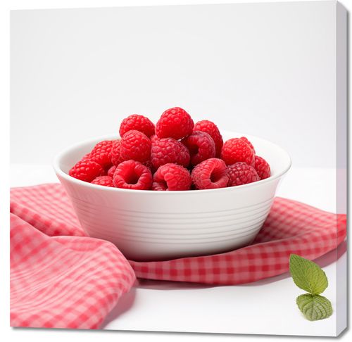 Obraz z serii wnętrza zatytułowany Lato w Misce. Na obrazie widnieje pełna misa soczystych, dojrzałych malin, które kontrastują swoją intensywną czerwienią z czystą bielą naczynia i tłem. Rozłożona obok misy czerwono-biała, kratka serwetka dodaje wiejskiego uroku, a pojedynczy listek mięty wprowadza świeży akcent. Ten obraz przyciąga wzrok swoją prostotą i elegancją, idealnie uchwycając esencję letniego sezonu i świeżości owoców. Doskonały do ożywienia kuchni, jadalni, a także jako element dekoracyjny w przestrzeniach, gdzie chce się wprowadzić nutę świeżości i naturalnego piękna. Zaprasza do celebracji zdrowego stylu życia i radości płynącej z prostych przyjemności.