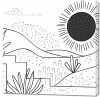 Obraz z serii minimalistyczne zatytułowany Linearny Pejzaż. Obraz przedstawia liniową ilustrację krajobrazu w czerni i bieli, gdzie przestrzeń zapełniają delikatne linie, kropki i abstrakcyjne formy roślinności. Centralnym punktem jest stylizowane słońce z promieniami rozchodzącymi się we wszystkie strony, towarzyszy mu mniejsze ciało niebieskie, które może symbolizować planetę lub księżyc. Lekkie kropki sugerują obecność piasku lub gwiazd, dodając elementu fantazji. Ten obraz wprowadzi do każdej przestrzeni element spokoju i prostoty. Idealnie nadaje się do nowoczesnych przestrzeni, takich jak minimalistyczne biura, jadalnie czy pokoje młodzieżowe, dostarczając neutralnej palety, która pasuje do wielu schematów kolorystycznych i stylów dekoracyjnych.