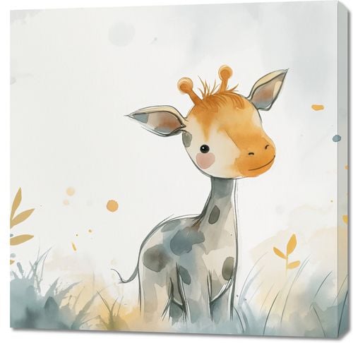 Obraz z serii wnętrza zatytułowany Mała Żyrafka. Uroczy obraz przedstawia młodą żyrafę o łagodnym spojrzeniu, wyłaniającą się z akwarelowej mgły pastelowych barw. Delikatne krople farby i subtelne linie tworzą atmosferę czystości i spokoju, nadając dziełu ciepły i relaksujący nastrój. Ten obraz, emanujący dziecięcą niewinnością i ciekawością świata, będzie idealnym dodatkiem do przestrzeni dziecięcej, takiej jak pokoje maluchów, przedszkola lub miejsca oczekiwania w placówkach pediatrycznych, zachęcając małych i dużych do marzeń i odkrywania piękna przyrody.