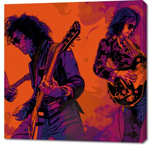 Obraz z serii pop art zatytułowany Mamy To Flow. Obrazuje trzech gitarzystów zanurzonych w pasji muzyki, z instrumentami w rękach, oddając ducha rock'n'rolla. Intensywne kolory, w tym głębokie odcienie pomarańczu i fioletu, tworzą tło, które pulsują energią i rytmem. Obraz oddaje esencję koncertowej atmosfery i jest hołdem dla klasycznych rockowych wirtuozów. Znakomicie wpasuje się w przestrzenie kulturalne, takie jak sale koncertowe, studia muzyczne, jak również jako żywiołowy akcent dekoracyjny w młodzieżowych pokojach czy salonach miłośników muzyki.