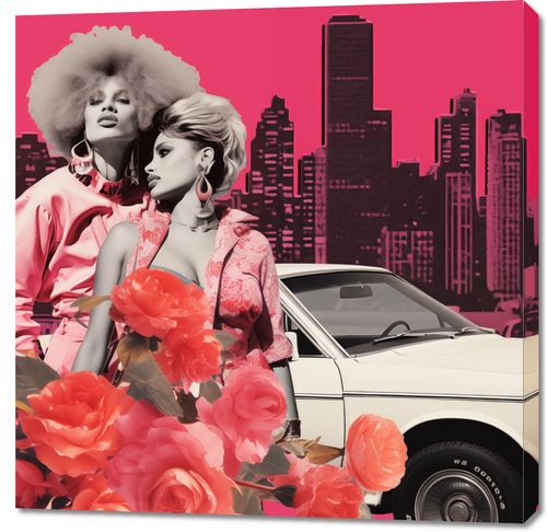 Obraz z serii pop art zatytułowany Metropolitalne Divy. Ta stylowa kompozycja łączy dynamikę miejskiego życia z vintage glamour, prezentując dwie kobiety w modnych strojach w tonacji różu, które emanują siłą i elegancją. Ich fryzury i dodatki nawiązują do lat 70. i 80., wprowadzając do obrazu powiew nostalgi. W tle widoczne są charakterystyczne dla wielkiego miasta sylwetki drapaczy chmur, wszystko utrzymane w wyrazistej, różowej kolorystyce, która nadaje plakatowi wyjątkowego charakteru. Na pierwszym planie, między postaciami, widnieje klasyczny samochód i bujny kwiat róż, dodający kompozycji romantycznej aury. Idealny dla wnętrz inspirowanych modą retro oraz dla miłośników miejskiego sznytu.