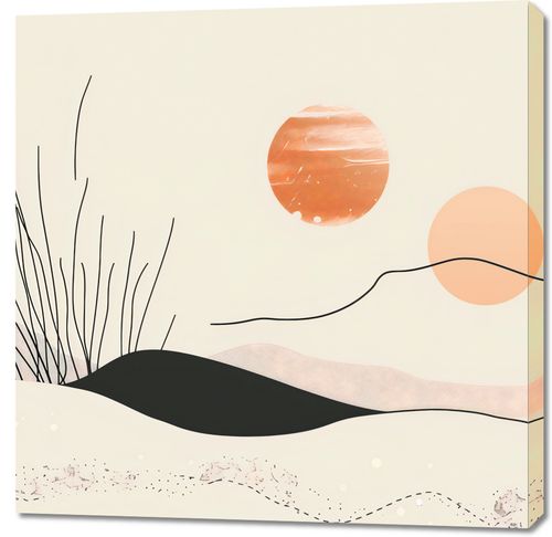 Obraz z serii boho zatytułowany Miękkie Wzgórze. Przedstawia on poetycką interpretację zachodzącego słońca, gdzie delikatne linie roślin wyłaniają się z miękkich, falujących wzgórz. Paleta kolorów to ciepłe odcienie beżu, różu oraz akcenty silniejszego pomarańczu i głębokiej czerni, które razem tworzą kojącą i spokojną atmosferę. Abstrakcyjne słońca o różnych odcieniach i wielkościach dodają kompozycji głębi i perspektywy. Ten obraz doskonale sprawdzi się jako akcent dekoracyjny w przestrzeniach, które mają być miejscem relaksu i odprężenia. Jego spokojna kolorystyka i delikatne linie będą komplementować wnętrza takie jak sypialnie, pokoje medytacyjne, gabinety relaksacyjne lub każde miejsce, które chce celebrować spokój i cichą elegancję.