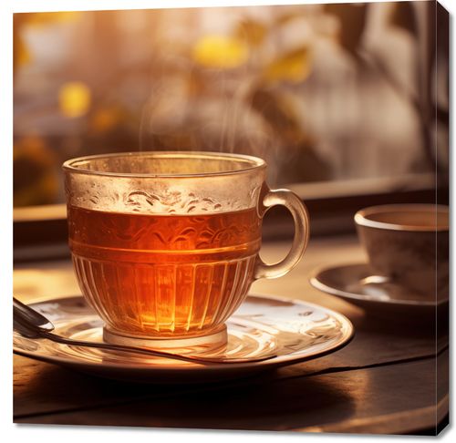 Obraz z serii wnętrza zatytułowany Moment Codzienności. Urokliwy obraz dwóch filiżanek herbaty, z których jedna uchwycona jest w chwili, gdy promienie porannego słońca przenikają przez jej bursztynową zawartość. Ciepłe światło i delikatna para unosząca się nad napojem emanuje atmosferę spokoju i przyjemności z porannego rytuału. Idealny do kuchni lub jadalni, aby dodać uczucie ciepła i domowego komfortu, a także doskonały jako prezent dla każdego miłośnika herbaty lub momentów refleksji.