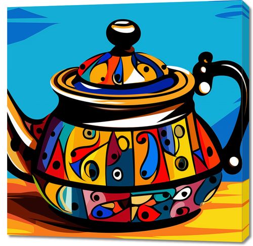 Obraz z serii pop art zatytułowany Może Herbatki?. Ta żywa i kolorowa ilustracja przedstawia czajnik w stylu pop-art, z wzorami przypominającymi prace modernistycznych malarzy. Barwna, geometryczna dekoracja czajnika, zestawiona z dynamicznym, niebieskim tłem, sprawia, że jest on nie tylko przedmiotem użytkowym, ale także dziełem sztuki. Kontrastujące kolory i wyraźne linie tworzą poczucie ruchu i energii. Obraz ten doda życia i charakteru każdej kuchni czy jadalni, inspirowanej sztuką i designem, będąc doskonałym prezentem dla miłośników wyjątkowych akcesoriów kuchennych.