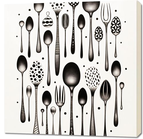 Obraz z serii wnętrza zatytułowany Narzędzia Smaku. Eleganckie sylwetki sztućców w różnorodnych kształtach i wzorach, podkreślane przez subtelne detale i geometryczne punkty, tworzą harmonijną i równocześnie zaskakującą kompozycję. Czarne i białe tony nadają prostotę i wyrafinowanie, podczas gdy unikalne projekty sztućców dodają nuty kreatywności i innowacji. Idealnie sprawdzi się w nowoczesnych kuchniach, restauracjach o minimalistycznym designie oraz w przestrzeniach dedykowanych sztuce kulinarnej.