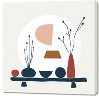 Obraz z serii boho zatytułowany Naturański Stół. Obraz to subtelna i uporządkowana prezentacja natury w stylizowanej, niemal scenicznej formie. Abstrakcyjne kształty w ciepłych i stonowanych kolorach przedstawiają wazony i rośliny na tle geometrycznych form przypominających wschód i zachód słońca. Kompozycja na neutralnym tle łączy sztukę z naturą w spójnym, współczesnym stylu. Dzieło to będzie idealnym uzupełnieniem wnętrz, w których ceniona jest prostota, ale jednocześnie szukających ciepła i naturalności. Może znaleźć miejsce w domowych salonach, jadalniach, lub jako urokliwy element w przestrzeniach biurowych, wniosąc odrobinę uroku i artystycznego nastroju.
