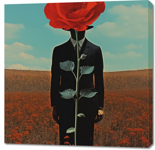 Obraz z serii abstrakcja zatytułowany Obserwator zza Maku. Ten obraz przedstawia surrealistyczny obraz człowieka z głową w formie rozkwitającego czerwonego maku, stojącego na polu pełnym kwiatów tej samej rośliny. Kompozycja gra na kontraście między ludzką postacią a bujnością natury, podkreślając połączenie człowieka z otaczającym go światem. Idealny dla przestrzeni szukających głębi artystycznej i wizualnej prowokacji, ten plakat będzie doskonałym dodatkiem do nowoczesnych salonów, galerii sztuki czy przestrzeni kreatywnych, gdzie może inspirować i wywoływać refleksję.
