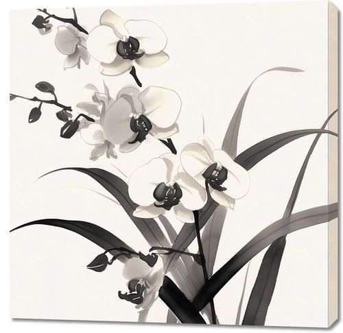 Obraz z serii wnętrza zatytułowany Orchidea. Na obraz widoczna jest stylizowana kompozycja kwiatów orchidei, przedstawiona w monochromatycznej kolorystyce. Dominują odcienie bieli i czerni, które tworzą silny kontrast, podkreślający delikatne kształty i szczegóły płatków oraz ciemniejsze środki kwiatów. Liście i łodygi są przedstawione w odcieniach szarości, co dodaje głębi i tekstury do obrazu. Całość kompozycji jest elegancka i nowoczesna, z subtelnymi gradientami i cieniowaniem dla realizmu. Tło jest jasne, co sprawia, że kwiaty wydają się jeszcze bardziej wyraziste. Ten obraz może być interpretowany jako połączenie naturalnego piękna z minimalistyczną estetyką, idealne do nowoczesnych wnętrz, które cenią sobie prostotę i elegancję.
