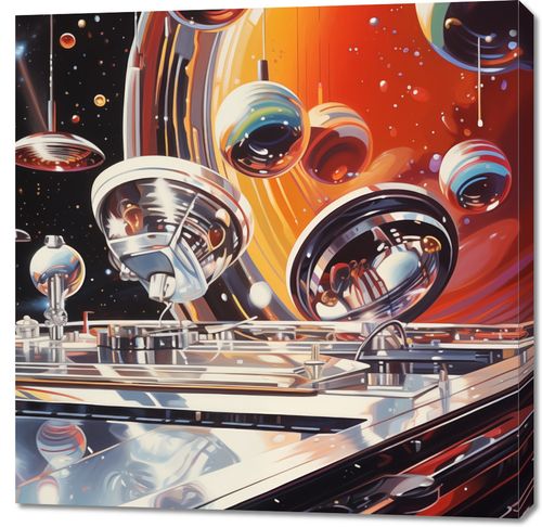 Obraz z serii pop art zatytułowany Orkiestra Sfer. Przedstawia futurystyczną symfonię kosmicznych stacji i satelitów, które unoszą się w przestrzeni wśród majestatycznych planet i wszechogarniających gwiazd. Bogate w detale, błyszczące konstrukcje odbijają się w lustrzanych powierzchniach, tworząc hipnotyzujące wzory świetlne, które przenoszą widza w odległy wymiar. Dynamiczna perspektywa i żywe kolory sprawiają, że obraz jest prawdziwym świadectwem ludzkiej wyobraźni i dążenia do odkrywania nieznanego. To dzieło doskonale nadaje się do nowoczesnych przestrzeni takich jak biura technologicznych firm, centra nauki, a także jako inspirujący element dla domowych biur i pokojów zabaw.