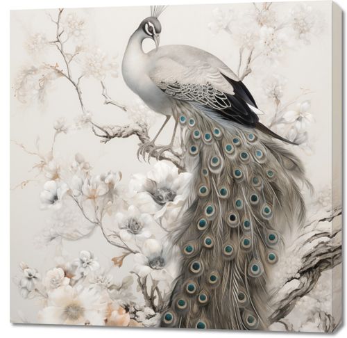 Obraz z serii wnętrza zatytułowany Pawia Gracja. Ta grafika przedstawia majestatycznego pawia spoczywającego na gałęzi, otoczonego przez delikatne kwiaty magnolii. Kunsztownie oddane detale piór i kwiatów w pastelowej palecie barw tworzą uczucie spokoju i harmonii. Obraz ten jest idealny dla miłośników piękna natury i sztuki, doskonale nadaje się do wnętrz o klasycznej i eleganckiej estetyce, takich jak salon, sypialnia, a także jako wyjątkowy element dekoracyjny w spa lub miejscach relaksacji.