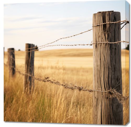 Obraz z serii pejzaże zatytułowany Płot na Polu. Obraz przedstawia rustykalny drewniany płot z drutem kolczastym, ciągnący się wzdłuż złocistego, zbożowego pola. Delikatne odcienie złota i brązu, w połączeniu z subtelnie rozmytym tłem, tworzą poczucie głębi i przestrzeni. Ten spokojny, wiejski krajobraz wprowadza atmosferę relaksu i odprężenia, idealnie nadając się do wnętrz inspirowanych naturą lub jako ukojenie dla zaganianych mieszkańców miast. Doskonały do salonu, jadalni lub jako element wypoczynkowej przestrzeni.