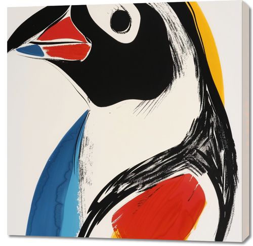 Obraz z serii abstrakcja zatytułowany Portret Ptaka. Prezentuje on stylizowany obraz ptaka, być może maskonura, z charakterystycznym dużym okiem i kolorowym dziobem. Artysta użył odważnych, geometrycznych kształtów i intensywnych barw, aby uchwycić esencję ptaka w prosty, ale wpadający w oko sposób. Duże bloki czerni, błękitu, czerwieni i żółci są zastosowane z lekkością pociągnięć pędzla, co nadaje dziełu lekkości i dynamiki. Ten obraz jest świadectwem tego, jak minimalizm może w pełni wyrazić piękno natury, będąc jednocześnie współczesnym i śmiałym elementem w każdym wnętrzu, od domowych przestrzeni po nowoczesne biura.