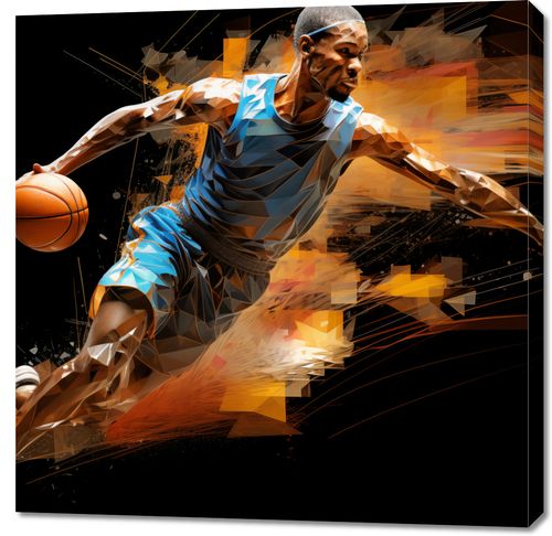 Obraz z serii abstrakcja zatytułowany Przełomowy Drybling. Na tym dynamicznym obrazie sportowiec w akcji wykonuje widowiskowy manewr na boisku do koszykówki. Jego sylwetka, uchwycona w pełnym ruchu, jest stylizowana na kolaż geometrycznych kształtów i energetycznych pociągnięć, które tworzą wrażenie szybkości i mocy. Kontrastujące, ciepłe barwy podkreślają ekspresję i intensywność momentu, a złamane linie i rozbryzgi dodają wizualnego napięcia. Ten obraz to hołd dla pasji i emocji towarzyszących sportowej rywalizacji, idealny dla każdego miłośnika koszykówki i dynamicznego, współczesnego designu.