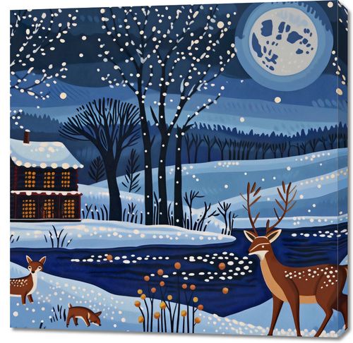 Obraz z serii abstrakcja zatytułowany Przyszła Zima. Obraz przedstawia malowniczą, zimową scenę w stylistyce folklorystycznej. Na obrazie dominują chłodne odcienie niebieskiego, tworząc nocny krajobraz pokryty śniegiem. Centralny motyw stanowi dom z oświetlonymi oknami, co nadaje scenie ciepły, przytulny akcent. Śnieg delikatnie opada na drzewa i dach domu, a pełnia księżyca rozświetla niebo, odbijając się w zamarzniętym strumieniu. Na pierwszym planie widać sylwetki zwierząt: dorosłego jelenia i młodego lisa, które dodają kompozycji naturalnego życia i ruchu. Tło przedstawia malownicze wzgórza i lasy, co współgra z idyllicznym, spokojnym nastrojem obrazu. Scena ta wywołuje uczucie spokoju i cichej radości, sprawiając, że plakat ten jest idealny do dekoracji wnętrz w zimowym okresie, dodając im ciepła i uroku.