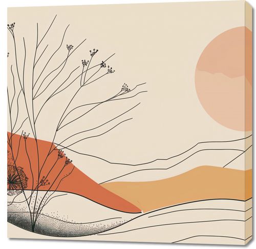 Obraz z serii boho zatytułowany Pustynna Wydma. Obraz ukazuje krajobraz z delikatnie zarysowanymi roślinami na tle łagodnych, pustynnych wydm. Spokojna kolorystyka, opierająca się na miękkich odcieniach beżu, pomarańczy i czerwieni, oddaje kojący klimat zmierzchu. W tle widoczne jest wielkie, ciepłe słońce, które rzuca złoty blask na całą scenę, nadając jej harmonijny charakter. Ten obraz będzie piękną dekoracją do wnętrz, które pragną wprowadzić elementy natury w połączeniu z minimalistycznym designem. Jego uspokajające barwy i proste linie idealnie wpasują się w przestrzenie takie jak sypialnie, salony, miejsca odpoczynku, czy nawet biura kreatywne, pragnące wykreować przestrzeń sprzyjającą relaksowi i inspiracji.