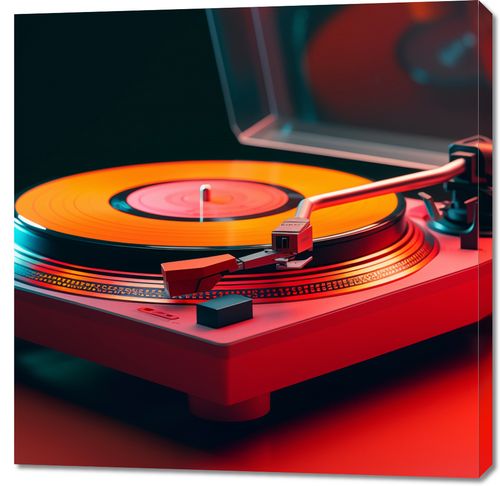 Obraz z serii pop art zatytułowany Retro Granie. Ta ilustracja ukazuje klasyczny gramofon w intensywnych kolorach, z winylową płytą obracającą się na talerzu. Ciepłe odcienie czerwieni i pomarańczy gramofonu kontrastują z chłodnymi, neonowymi akcentami w tle, tworząc nowoczesny, a jednocześnie nostalgicznym klimat. Obraz oddaje hołd złotej erze muzyki winylowej i jest idealnym elementem dekoracyjnym dla miłośników muzyki, dodającym charakteru każdemu wnętrzu, od salonów po muzyczne kąciki czy studia nagrań.