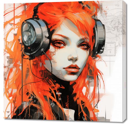 Obraz z serii pop art zatytułowany Rytm Metropolii. Dynamiczna kompozycja łączy portret kobiety o wyrazistych, pomarańczowych włosach z elementami miejskiego krajobrazu. Jej spojrzenie jest intensywne i pełne pasji, zaś duże słuchawki na uszach sugerują miłość do muzyki i rytmu wielkiego miasta. Abstrakcyjne linie i kształty, mieszające się z realistycznie oddaną postacią, tworzą wrażenie ruchu i pulsującej energii. To dzieło sztuki jest idealne dla miłośników muzyki, street artu i nowoczesnego designu, doskonale nadając się do wnętrz loftów, studiów muzycznych czy awangardowych salonów, które pragną podkreślić miejski charakter swojej przestrzeni.