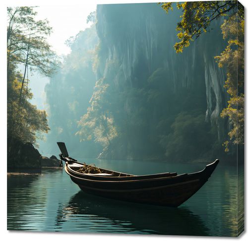 Obraz z serii pejzaże zatytułowany Samotność na Tafli przedstawia idylliczny krajobraz, w którym centralnym punktem jest drewniana łódka unosząca się na spokojnych wodach jeziora. Otoczona przez majestatyczne, zielone drzewa i klify, które otulają wodę jak opiekuńcze ramiona, scena ta jest utrzymana w ciepłych, naturalnych barwach. Promienie słoneczne przebijają się przez liście, tworząc efekt tajemniczego światła i cieni na wodnej tafli. Całość kompozycji wywołuje uczucie spokoju i kontemplacji, idealnie oddając atmosferę zacisznego zakątka, oderwanego od zgiełku codzienności. Obraz ten będzie pasował do wnętrz, które pragną podkreślić łączność z naturą i stworzyć oazę spokoju, takich jak gabinety relaksacyjne, pokoje medytacyjne czy nawet jako spokojny akcent w nowoczesnych biurach.