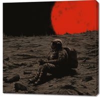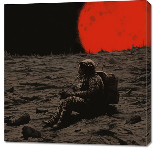 Obraz z serii abstrakcja zatytułowany Samotność w Kosmosie przedstawia astronautę siedzącego na pustkowiu księżycowym, z ogromną czerwoną gwiazdą w tle. Osamotniony kosmonauta wygląda na zamyślonego lub odpoczywającego, otoczony przez surowy, nierówny krajobraz księżycowy, z jego charakterystycznymi kraterami i szczytami. Obraz emanuje głębokim spokojem i izolacją, podkreślając zarówno piękno, jak i nieprzewidywalność przestrzeni kosmicznej. Wyrazisty kontrast między ciemnymi skałami a jaskrawą gwiazdą podkreśla dramatyczną aurę tej sceny. Ten obraz idealnie nadawałby się do dekoracji ścian w domowych biurach lub przestrzeniach edukacyjnych, inspirowanych tematyką kosmiczną.
