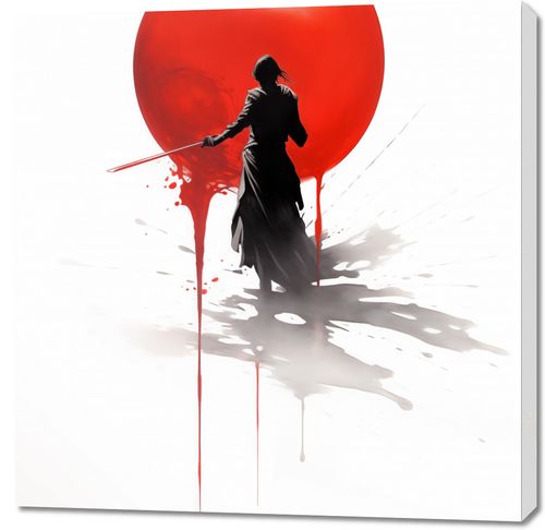 Obraz z serii motywy wschodnie zatytułowany Samotny Samuraj przedstawia postać w tradycyjnym japońskim stroju, samuraja, w dynamicznej pozie z mieczem, z potężnym, czerwonym słońcem w tle. Design wykorzystuje silne kontrasty kolorystyczne - biel i czerń z akcentami czerwieni, aby stworzyć dramatyczną i potężną wizualizację. Przedstawienie samuraja w akcji z rozpryskami tuszu naokoło podkreśla ruch i energię, a jednocześnie oddaje hołd tradycyjnym technikom japońskiego malarstwa atramentem. Ten obraz to doskonały wybór dla miłośników japońskiej kultury i sztuk walki, idealny do wnętrz nowoczesnych jak i tych o bardziej klasycznym charakterze.