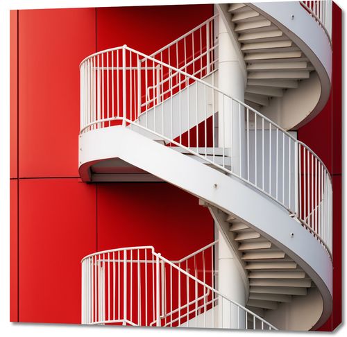 Obraz z serii wnętrza zatytułowany Schody do Niebios. Ten obraz to dynamiczne zestawienie białej, spiralnej klatki schodowej z intensywnie czerwonym tłem ściany budynku. Czyste linie, krzywe i kolorystyczny kontrast tworzą wyrafinowaną kompozycję, która łączy funkcjonalność z estetyką. Idealny dla nowoczesnych przestrzeni komercyjnych i mieszkalnych, które chcą wnieść element współczesnego designu i architektonicznej odwagi, ten plakat jest doskonałym wyborem dla miłośników designu, architektów oraz wszystkich, którzy cenią sobie wyrazistość i mocne, wizualne wrażenie.