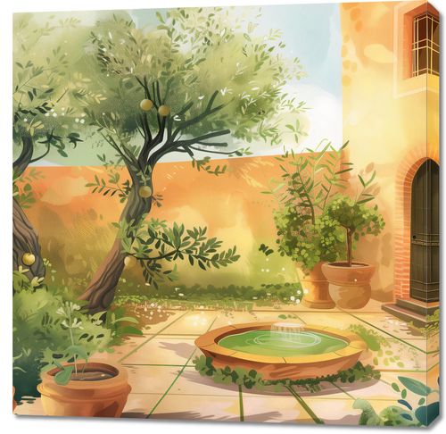 Obraz z serii abstrakcja zatytułowany Słoneczny Dzień. Obraz ukazuje idylliczny ogród w ciepły, słoneczny dzień. Widoczna jest część kamiennego patio otoczonego bujną roślinnością, z dojrzałymi cytrynami wiszącymi na gałęziach niewielkich drzew. W centrum kompozycji znajduje się dekoracyjny kamienny basen z delikatnym strumieniem wody. Na pierwszym planie widać donice z różnorodnymi roślinami, które dodają scenie domowego ciepła. Jaskrawość słońca jest złagodzona przez liście drzew, tworząc wzorzyste cienie na płytach chodnika. Architektura w tle, z żółtymi ścianami i ciemnymi drewnianymi drzwiami, współgra z naturalną paletą kolorów ogrodu. Atmosfera obrazu jest spokojna i relaksująca, sugerująca miejsce ucieczki i odpoczynku.