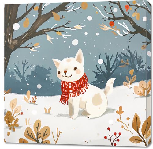 Obraz z serii wnętrza zatytułowany Śnieżny Kompan. Urocze przedstawienie białego, puchatego psa w czerwonym szaliku, który przywołuje ciepłe uczucia w chłodnym, zimowym otoczeniu. Zwierzę z radosnym wyrazem twarzy wydaje się cieszyć spadającymi płatkami śniegu, co dodaje obrazowi poczucia radości i bezpretensjonalnej zabawy. Tło w pastelowych odcieniach bieli i szarości z delikatnymi akcentami kolorystycznymi tworzy spokojną i relaksującą atmosferę. Obraz idealnie nadaje się do dekoracji pomieszczeń dziecięcych, salonów, czy przytulnych kawiarni, wprowadzając do wnętrza element zabawy i niewinności. Jego ciepłe barwy i sympatyczny motyw sprawią, że będzie doskonałym dodatkiem do miejsc, w których chcemy poczuć odrobinę zimowego ciepła i uroku.