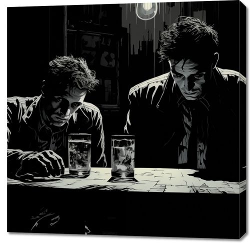 Obraz z serii abstrakcja zatytułowany Spiskowcy. Ta grafika przedstawia dwóch mężczyzn zanurzonych w głębokiej konwersacji przy barowym stole. Stylizacja na czarno-biało uchwyciła napięte, dramatyczne oświetlenie i cienie, które nadają scenie klimat tajemniczości i suspensu. Wyraźne kontury i kontrastowe światłocienie podkreślają wyraziste postaci mężczyzn i ich zacięte postawy. Obraz ten przemawia do miłośników klasycznego kina i literatury, doskonale nadając się do dekoracji przestrzeni o męskim charakterze, takich jak prywatne gabinety, domowe bary czy miejsca spotkań.