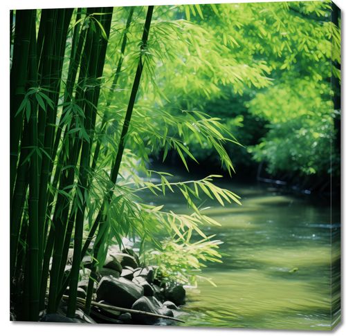 Obraz z serii natura zatytułowany Spokój Bambusów. Ukazuje on idylliczny zakątek przyrody, gdzie zielone pędy bambusa delikatnie zginają się nad błogim, spokojnie płynącym strumieniem. Gra światła i cienia na liściach bambusa tworzy wrażenie głębi i spokoju, zaś szemrząca woda dodaje uczucie świeżości i czystości. Ten obraz oddaje piękno i spokój odosobnionego zakątka natury, jest więc idealny dla przestrzeni relaksacyjnych takich jak spa, pokoje do medytacji lub jako ukojenie w zgiełku codzienności w domowych wnętrzach. To doskonała dekoracja dla tych, którzy pragną wprowadzić element natury i harmonii do swojego otoczenia.