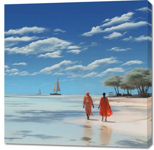 Obraz z serii pejzaże zatytułowany Spokój w Piaskach przedstawia dwie postacie w tradycyjnych pomarańczowych szatach, kroczących boso po dziewiczym piasku plaży. Ich spokojny postęp odzwierciedla harmonię i spokój, a delikatne fale i żaglowce w tle dodają uczucia swobody. Płynące chmury na niebie nadają scenie wrażenie przestrzeni i czasu, który wydaje się zatrzymany. Ten obraz emanuje duchowym spokojem i jest idealny do pomieszczeń przeznaczonych do medytacji, wypoczynku lub terapii, a także jako spokojny akcent w przestrzeniach hotelowych czy biurowych, gdzie zachęca do refleksji i wewnętrznej harmonii.
