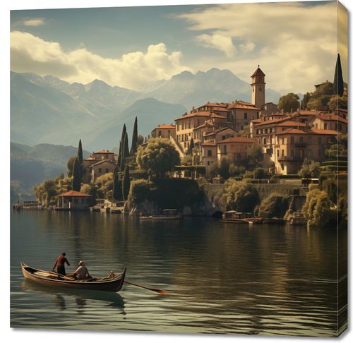 Obraz z serii pejzaże zatytułowany Spokojna Nostalgia, ten urzekający pejzaż przenosi nas do sielankowej wioski nad jeziorem, gdzie czas zdaje się płynąć wolniej. Łagodne światło rozlewające się nad architekturą wioski i gładką powierzchnią wody tworzy poczucie ciepła i spokoju. Para przemieszczająca się łodzią dodaje element ludzki, harmonijnie wpisując się w krajobraz. To dzieło sztuki idealnie nadaje się do przestrzeni, które mają na celu wprowadzenie atmosfery spokoju i refleksji, takich jak biblioteki, poczekalnie lub prywatne gabinety, zapewniając odprężającą ucieczkę od codziennego zgiełku.