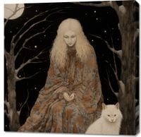 Obraz z serii wnętrza zatytułowany Stróżka Leśna. Ta eteryczna praca artystyczna ukazuje postać kobiecą, owiniętą w szatę z motywem leśnym, zatopioną w kontemplacji pod gałęziami drzew oplecionych przez śnieg i w blasku pełnego księżyca. Jej spokojna obecność i blady odcień skóry kontrastują z ciemnością nocy, a towarzyszący jej biały wilk dodaje elementu dzikości i tajemniczości. Obraz oddaje uczucie spokoju i jedności z naturą, a jednocześnie wzbudza ciekawość dotyczącą ukrytych opowieści i starych legend. Idealny dla miłośników fantastyki, mitologii, oraz tych, którzy pragną wprowadzić do swojego wnętrza elementy oniryczne i magiczne.