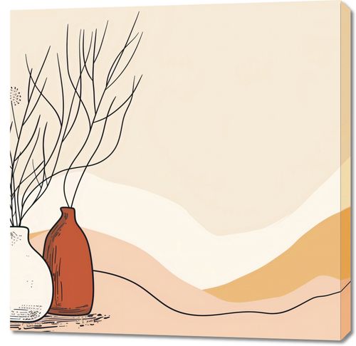 Obraz z serii minimalistyczne zatytułowany Stylowe Beże. Obraz przedstawia uproszczoną, elegancką kompozycję waz z suszonymi roślinami na tle delikatnych, pustynnych wzgórz. Wazony o prostych formach i kontrastowych kolorach - jeden biały, drugi w odcieniu ciepłej cegły - stoją przed zmiennym tłem beżów i brązów. Rośliny zostały przedstawione za pomocą czarnych, finezyjnych linii, które dają iluzję delikatności i subtelności. Obraz z łatwością wpasuje się w różne wnętrza dzięki swojej neutralnej palecie kolorów i prostocie form. Będzie doskonałym wyborem do pomieszczeń urządzonych w stylu skandynawskim, boho, a także w nowoczesnych przestrzeniach biurowych. Zapewnia ciepło i wyrafinowanie, a jednocześnie nie przytłacza przestrzeni.