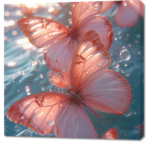 Obraz z serii natura zatytułowany Świetliste Motyle. Na obrazie widzimy delikatne motyle o przezroczystych, różowych skrzydłach, unoszące się nad wodą i łagodnie odbijające światło słoneczne. Kropelki wody na ich skrzydłach dodają uczucia świeżości i czystości. Obraz emanuje spokojem i pięknem, idealnie nadając się do przestrzeni, które chcą wprowadzić element relaksu i spokoju, takich jak spa, pokoje medytacyjne, a także jako łagodny element dekoracyjny do domu.