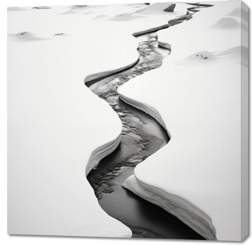 Obraz z kolekcji pejzaże zatytułowany Meandry Mrozu. Ten obraz przedstawia sinący lodowiec, którego szczeliny przecinają śnieżnobiałą powierzchnię, tworząc naturalne dzieło sztuki. Monochromatyczna paleta barw, gdzie biel śniegu kontrastuje z głębokim czerniami wód lodowcowych, przemawia do wyobraźni i wywołuje uczucie surowości oraz majestatu natury. Doskonały do wnętrz o minimalistycznym designie lub jako mocny wizualny akcent w przestrzeniach takich jak salony, biura i lobby hotelowe, gdzie może inspirować do refleksji nad pięknem i siłą przyrody.